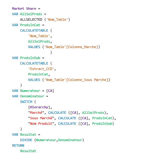 Problématique: Nous souhaitons calculer dans PowerBI la part de marché d’un produit par rapport à un sous-marché et/ou un marché.